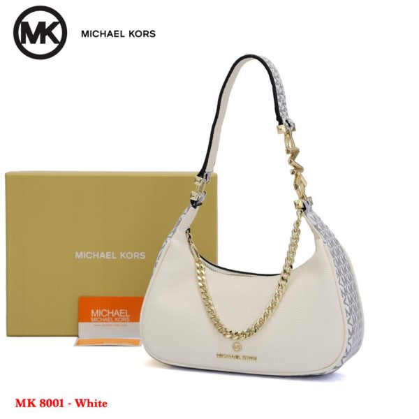 This Michael Kors MK 8001 – White handbag showcases a sophisticated and modern design, ideal for both casual and formal settings. The bag is crafted in a crescent shape with a smooth white leather texture, exuding elegance and simplicity.