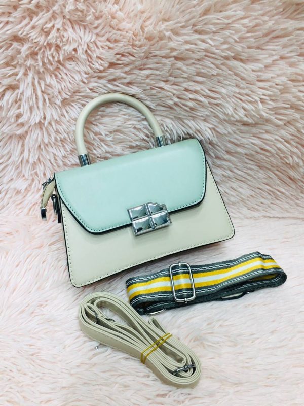 This is a stylish, mini handbag with a compact design. The bag has a modern color-block style featuring soft pastel tones—mint green on the flap and beige for the body. It includes a sleek silver metallic clasp in the center, adding a touch of sophistication.
